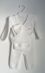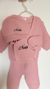 La tenue, douce et confortable, est disponible en plusieurs coloris elle inclue un haut, un bas, des chaussettes et un bonnet. Chaque piÚce est réalisée à la main avec soin et amour.